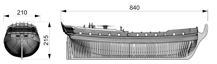 Scale 1/48 Length 1250 mm Width 300 mm Height 335 mm External keel: Simulation of cherry wood splicing internal keel: