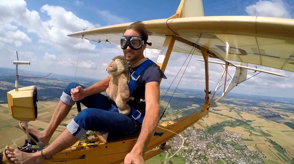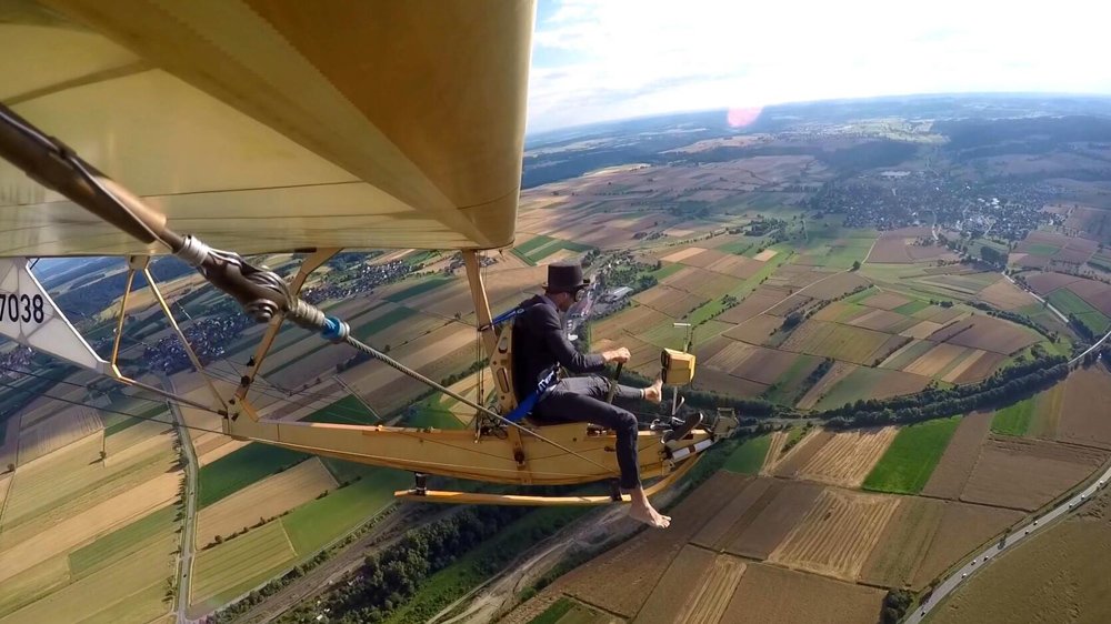 The pilot sits on a simple seat in the open air, without a windshield.